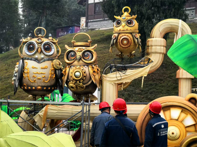 “这组作品的名字叫‘朋克双宝’,该灯组长75米,宽53米,高16米,我们将蒸汽朋克元素与卡通形象巧妙融合,憨态可掬的大熊猫头戴七彩礼帽,乘坐‘悬空’飞碟,与‘工程师’金丝猴一起穿越时空,开启一场奇幻冒险之旅。”担任这组彩灯设计、制作的传奇彩灯公司负责人陈军告诉小编,悬空造型的灯组,是自贡灯会首创的艺术呈现形式,也是历届灯会最受游客欢迎的灯组之一。