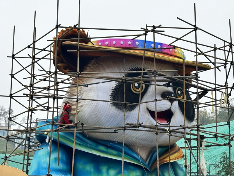 制作中的熊猫彩灯